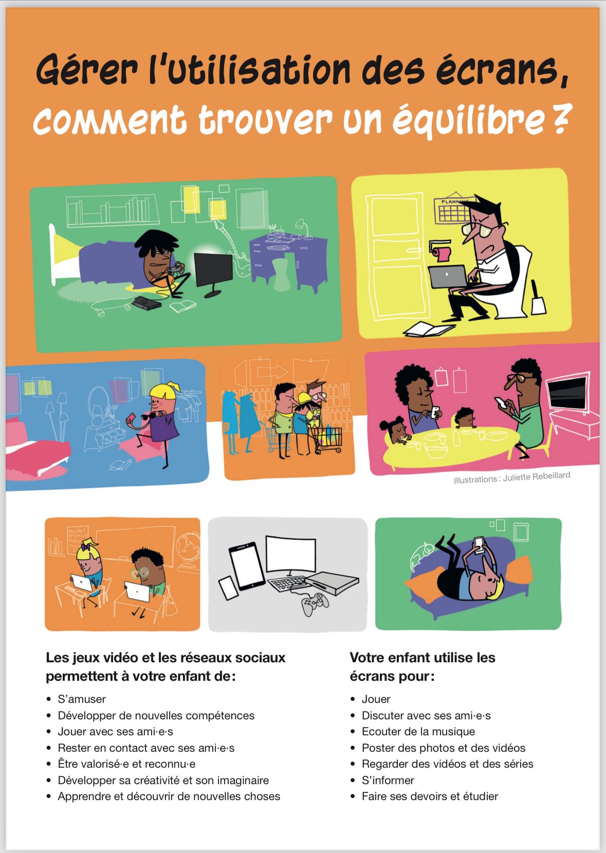 Vous y trouverez certaines ressources qui font le point sur les enjeux de notre usage des écrans au sein de la famille et notamment une vidéo proposant des solutions simples pour les intégrer sans se laisser déborder.
